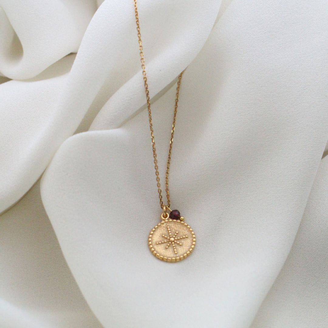 Szukasz biżuterii, która nie tylko ozdobi Twój dekolt, ale również będzie dla Ciebie talizmanem? Nasz naszyjnik Kompas z granatem i srebrem złoconym 24-karatowym złotem to idealny wybór!