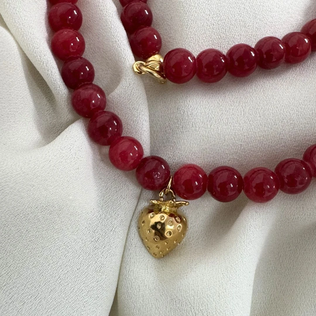 Całość dopełnia delikatna zawieszka w kształcie truskawki wykonana ze srebra pr. 925 złoconego 24k złotem, która dodaje biżuterii lekkości i kobiecego uroku.