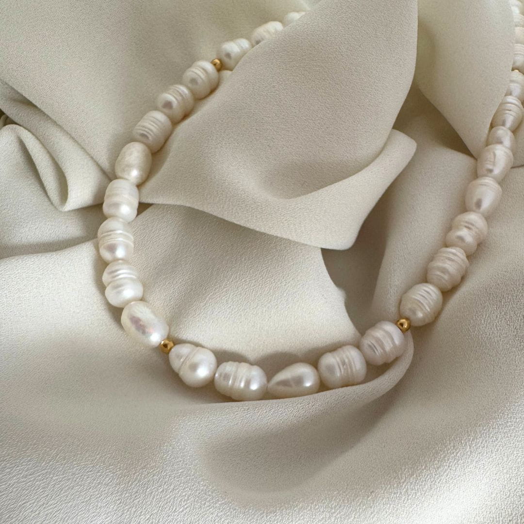 Odkryj ponadczasowe piękno z naszym naszyjnikiem z pereł, który łączy klasyczną elegancję z nowoczesnym akcentem. Ten wyjątkowy dodatek został wykonany z lśniących pereł hodowlanych (około 8-10 mm), których subtelny blask idealnie współgra z najwyższej jakości srebrem, pokrytym 24-karatowym złotem. Całość tworzy harmonijną kompozycję, która dodaje uroku i szyku każdej stylizacji. Z długością około 45 cm, naszyjnik pięknie układa się na dekolcie, będąc idealnym wyborem zarówno na co dzień, jak i na wyjątkowe okazje. Podkreśl swoją elegancję z tym niezrównanym połączeniem natury i luksusu.