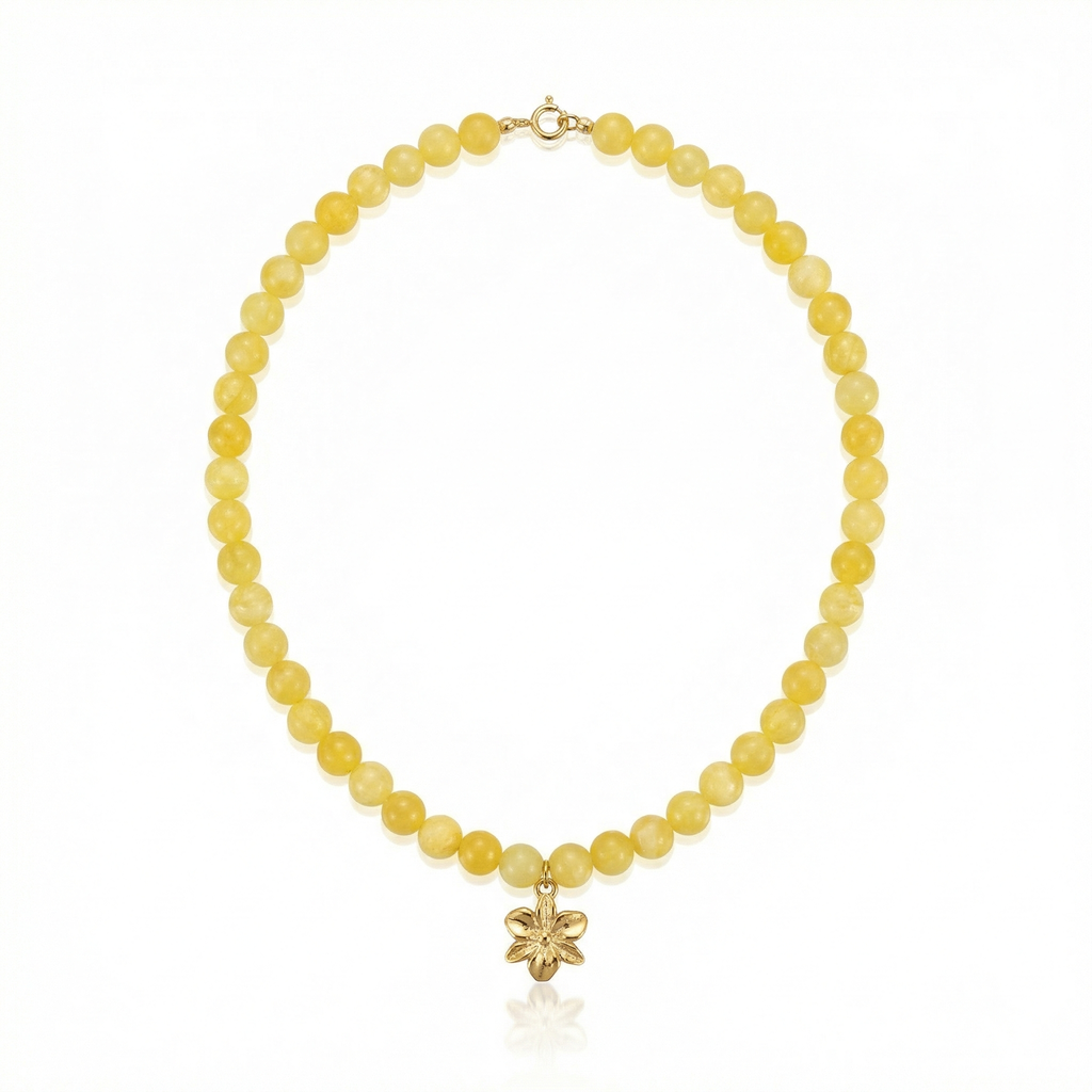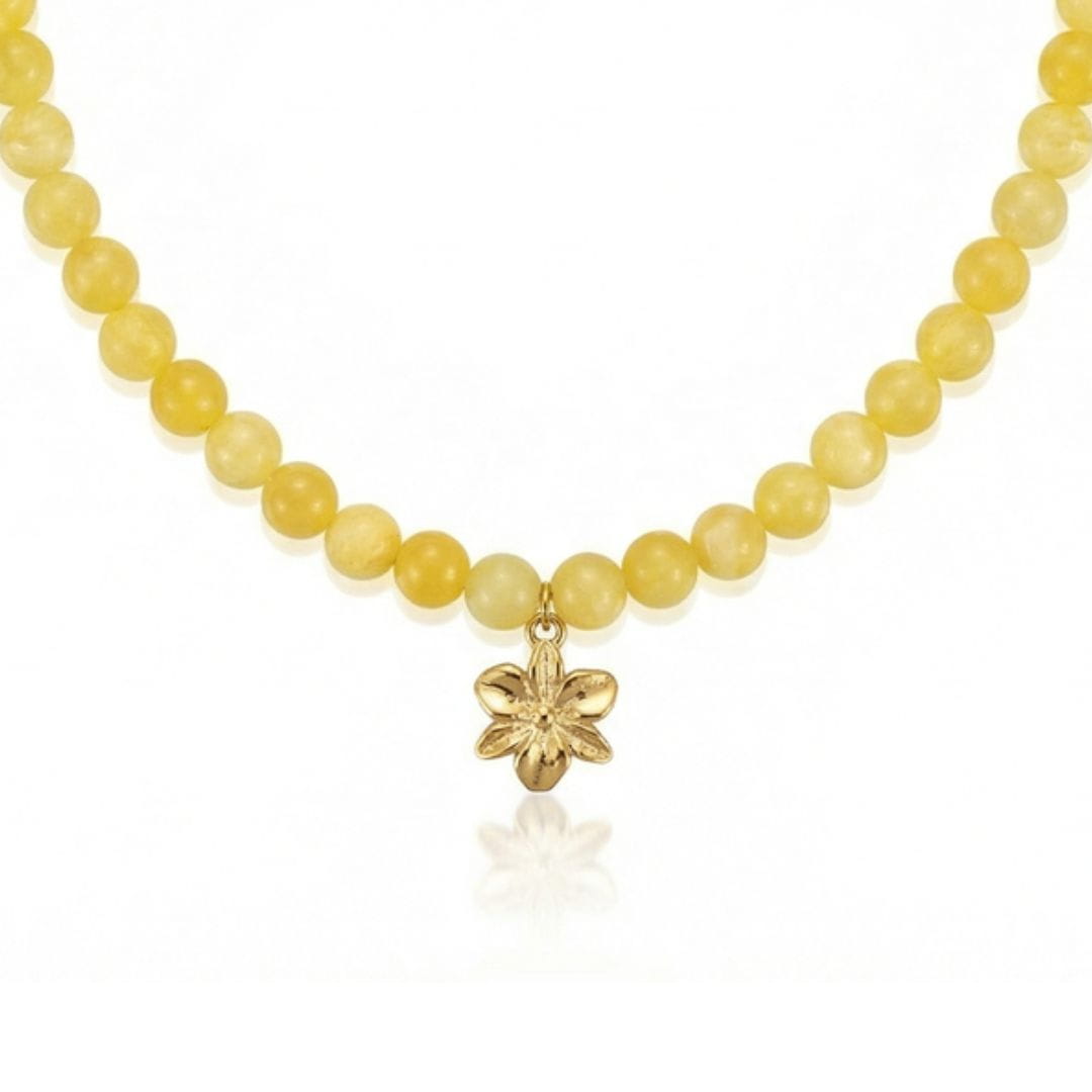 Subtelny naszyjnik wykonany z naturalnych Jadeitów w delikatnym, żółtym odcieniu, uzupełniony pozłacaną zawieszką w kształcie kwiatka.