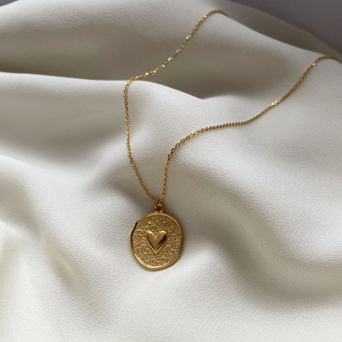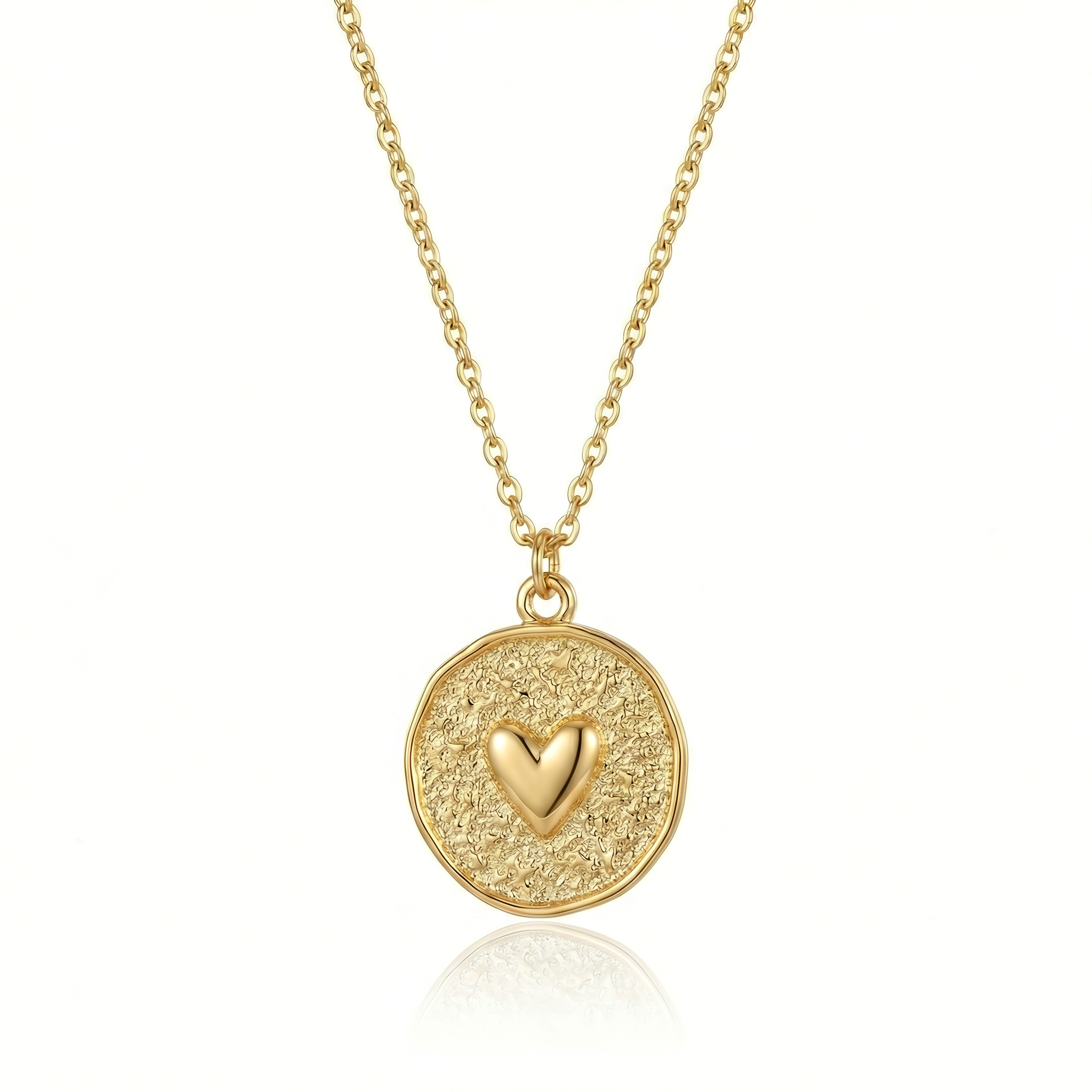 Delikatny złoty naszyjnik z okrągłą, nieregularną zawieszką i motywem serca. Minimalistyczny design, subtelny blask i ponadczasowa forma – idealny na co dzień i na prezent.